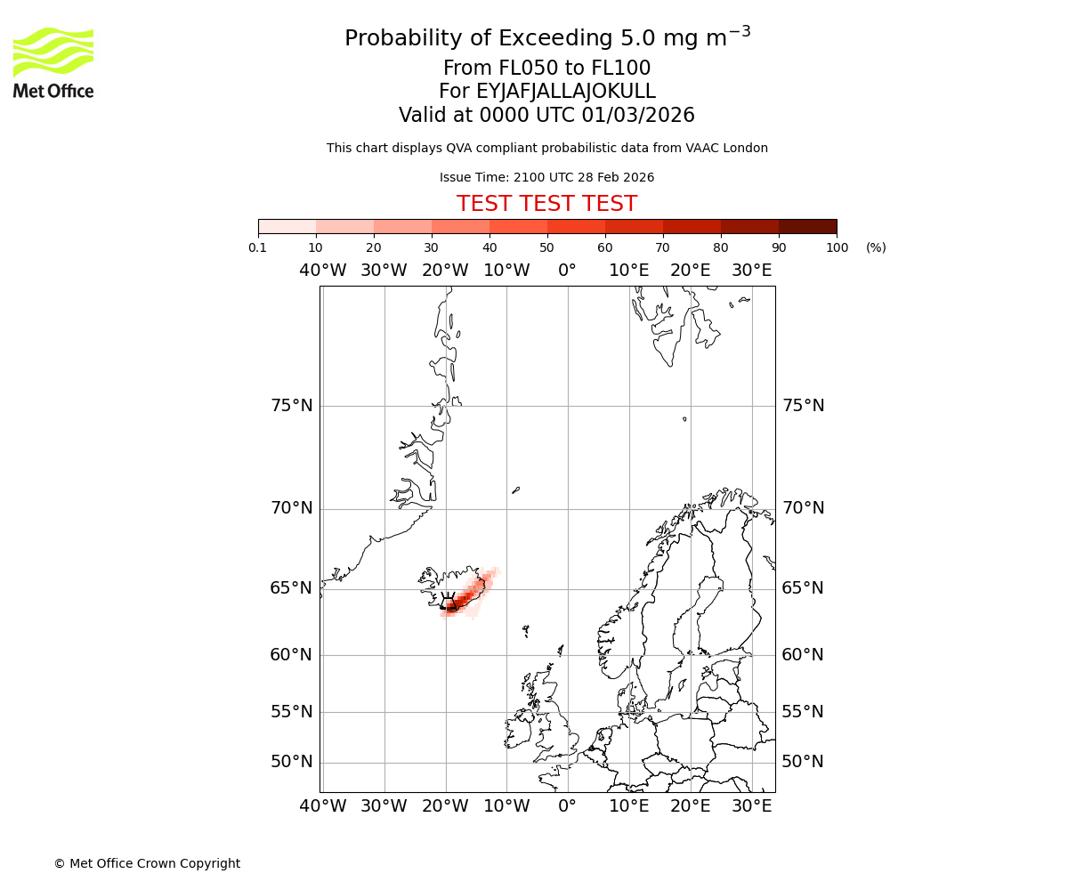 Probability of exceeding 5.0 milligrams per metre cubed. From 000 to 050 for EYJAFJALLAJOKULL. Valid at 0000 UTC 01/03/2026