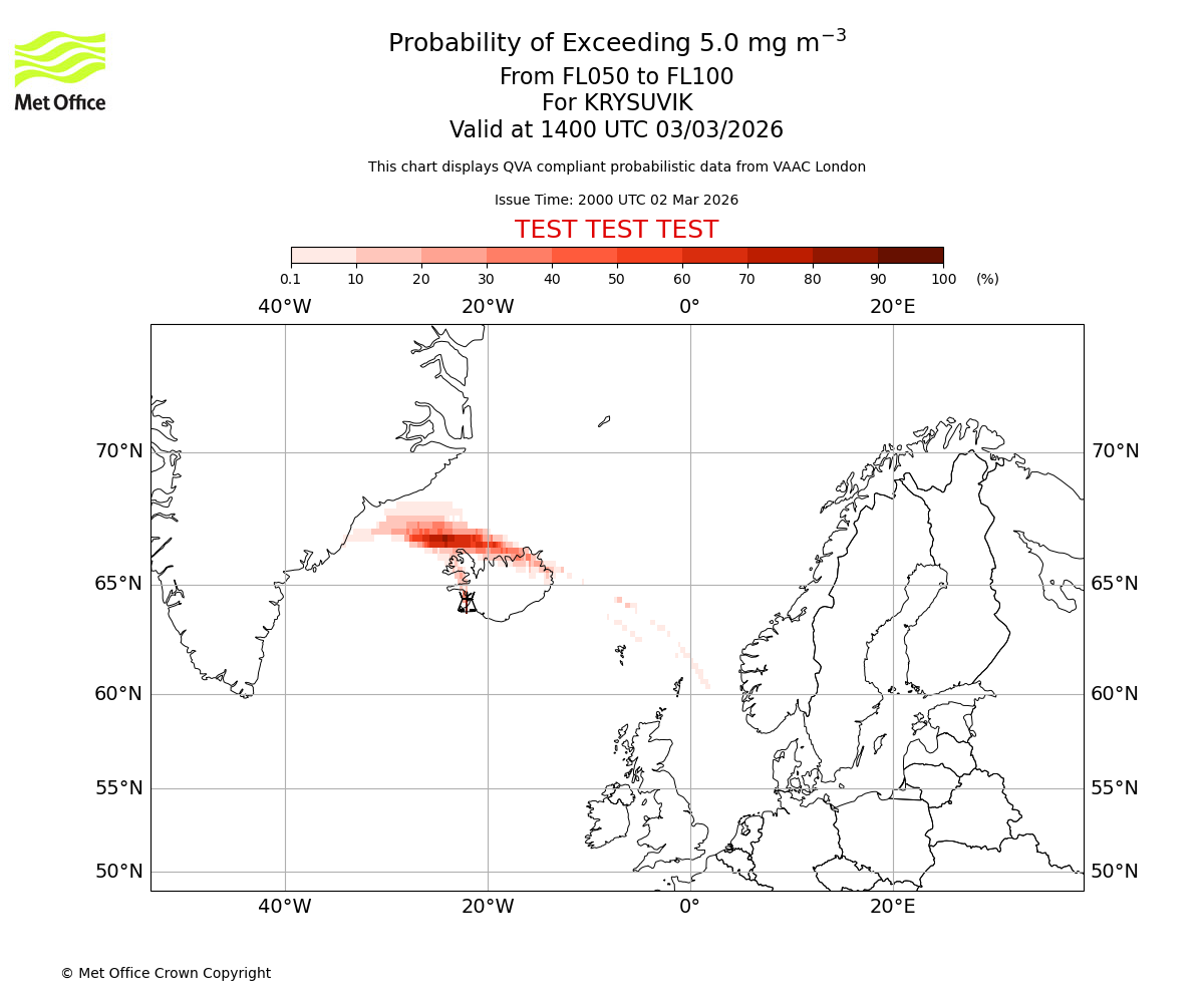 Modelled ash concentration from 000 to 050 for KRYSUVIK. Valid at 2000 UTC 02/03/2026
