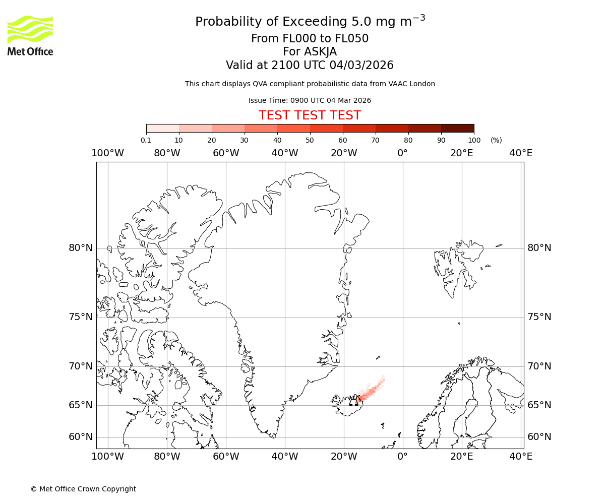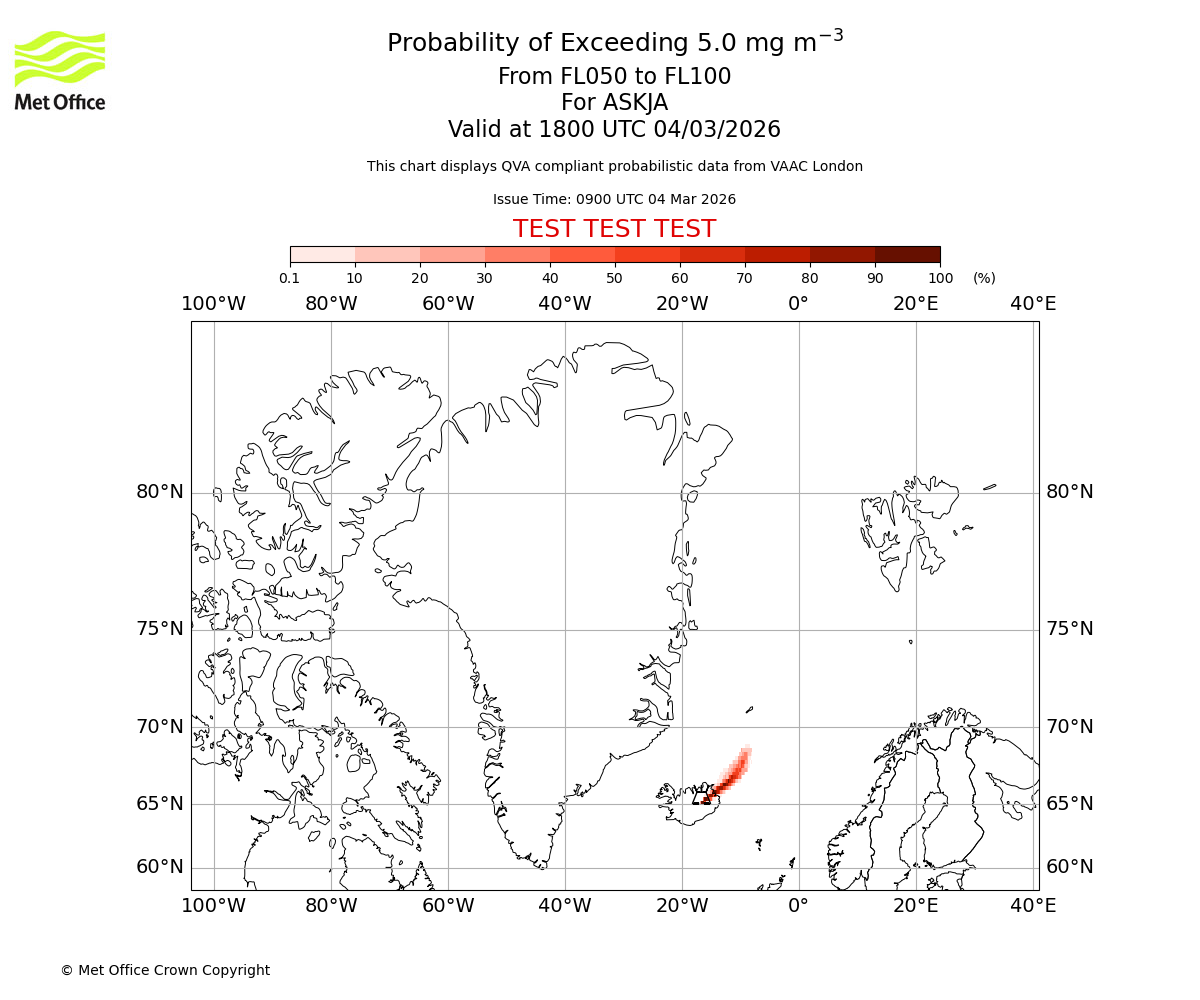 Probability of exceeding 5.0 milligrams per metre cubed. From 000 to 050 for ASKJA. Valid at 1800 UTC 04/03/2026