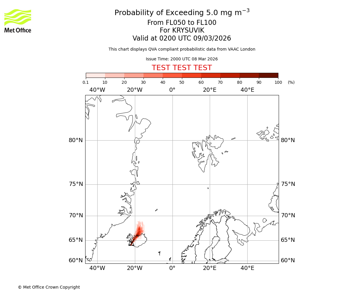 Probability of exceeding 5.0 milligrams per metre cubed. From 000 to 050 for KRYSUVIK. Valid at 0200 UTC 09/03/2026