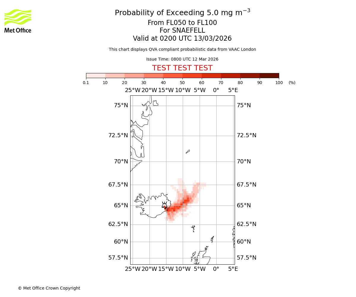 Probability of exceeding 5.0 milligrams per metre cubed. From 000 to 050 for SNAEFELL. Valid at 0200 UTC 13/03/2026