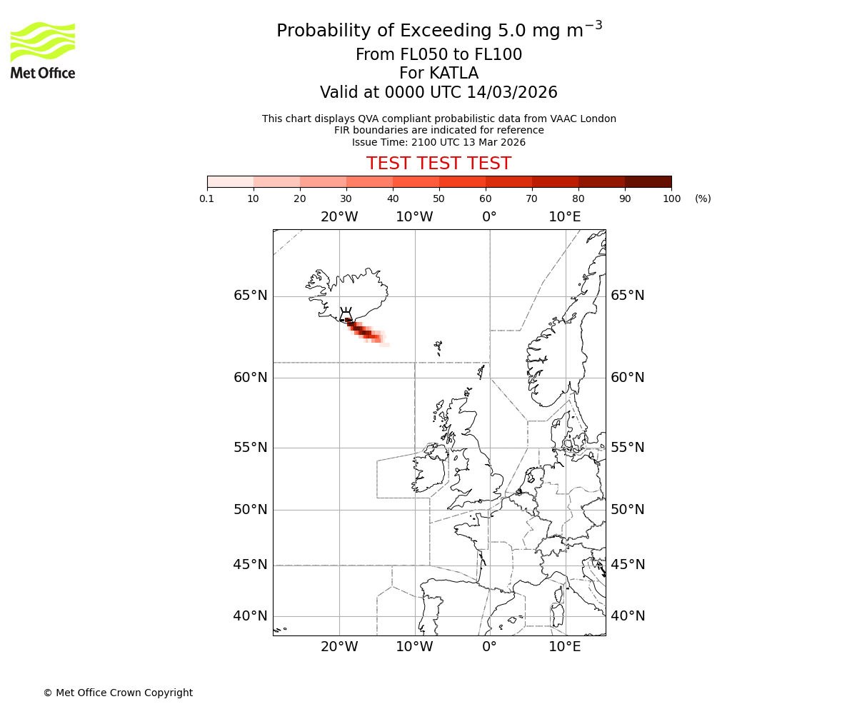 Probability of exceeding 5.0 milligrams per metre cubed. From 000 to 050 for KATLA. Valid at 0000 UTC 14/03/2026