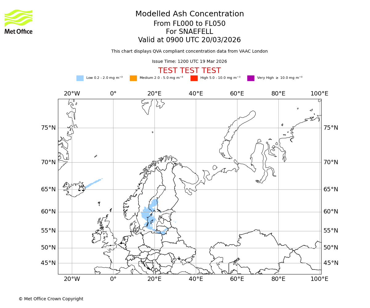 Modelled ash concentration from 000 to 050 for SNAEFELL. Valid at 0600 UTC 20/03/2026