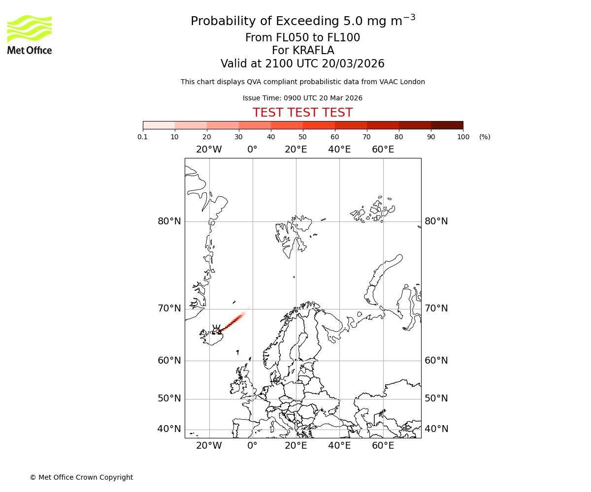 Probability of exceeding 5.0 milligrams per metre cubed. From 000 to 050 for KRAFLA. Valid at 2100 UTC 20/03/2026