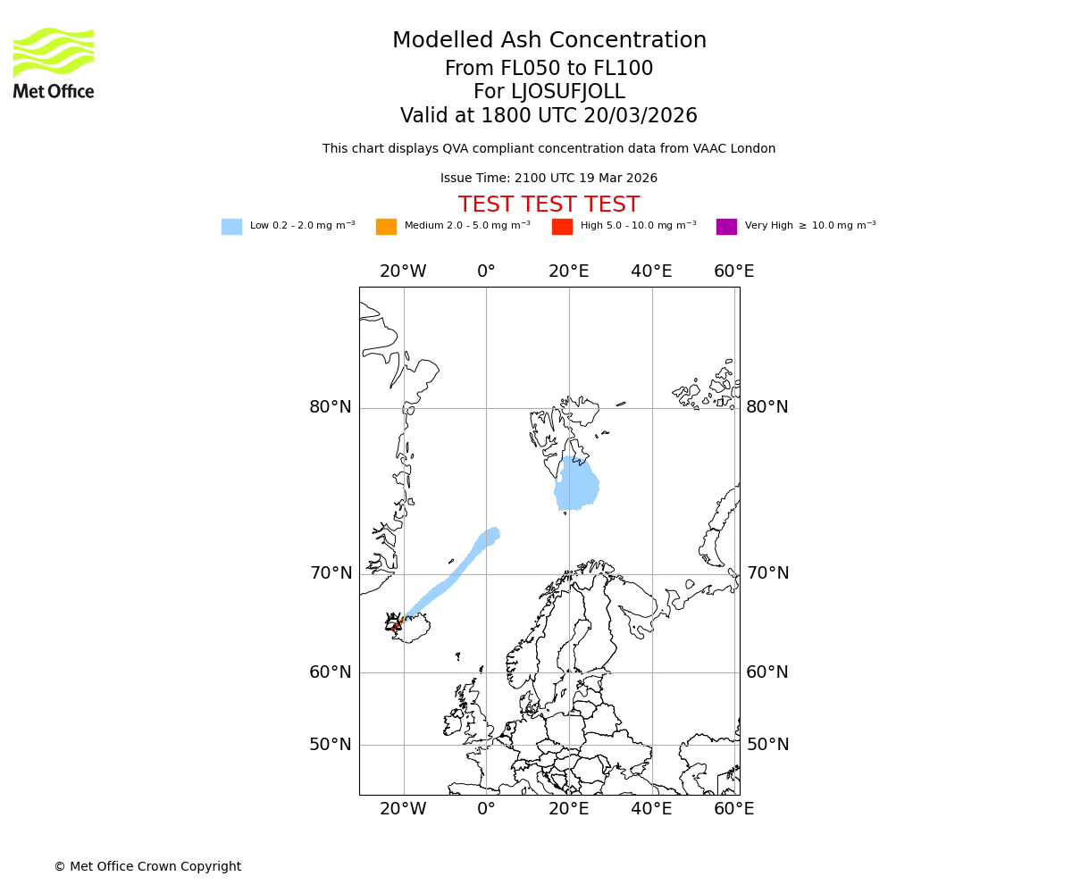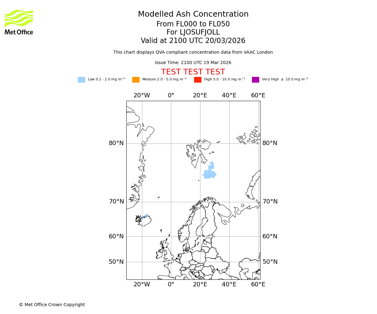 Modelled ash concentration from 000 to 200 for LJOSUFJOLL. Valid at 2100 UTC 19/03/2026