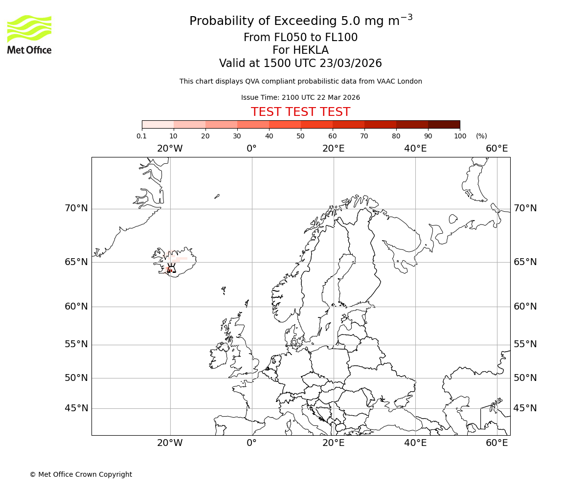 Probability of exceeding 5.0 milligrams per metre cubed. From 000 to 050 for HEKLA. Valid at 1500 UTC 23/03/2026