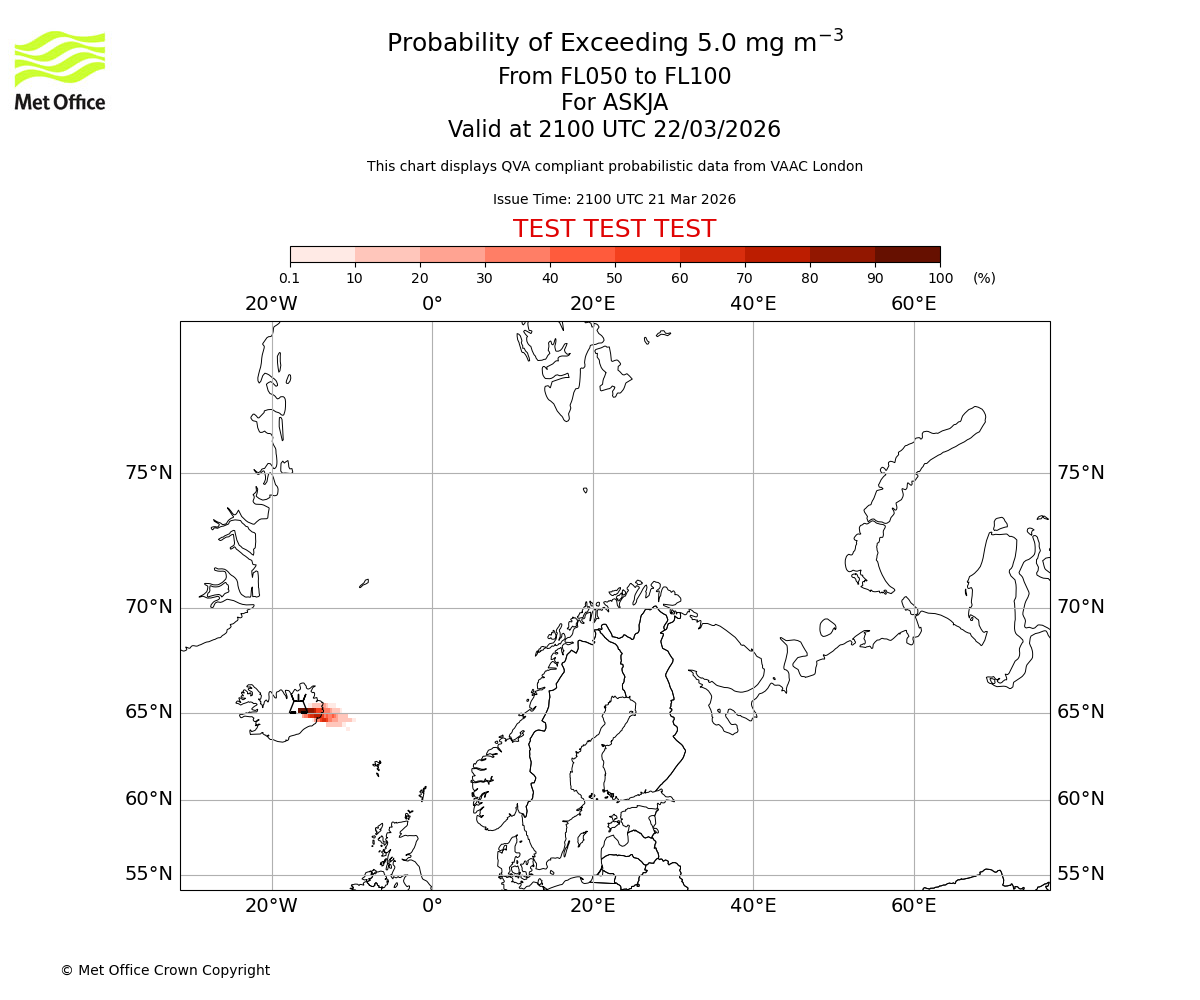 Probability of exceeding 5.0 milligrams per metre cubed. From 000 to 050 for ASKJA. Valid at 2100 UTC 22/03/2026
