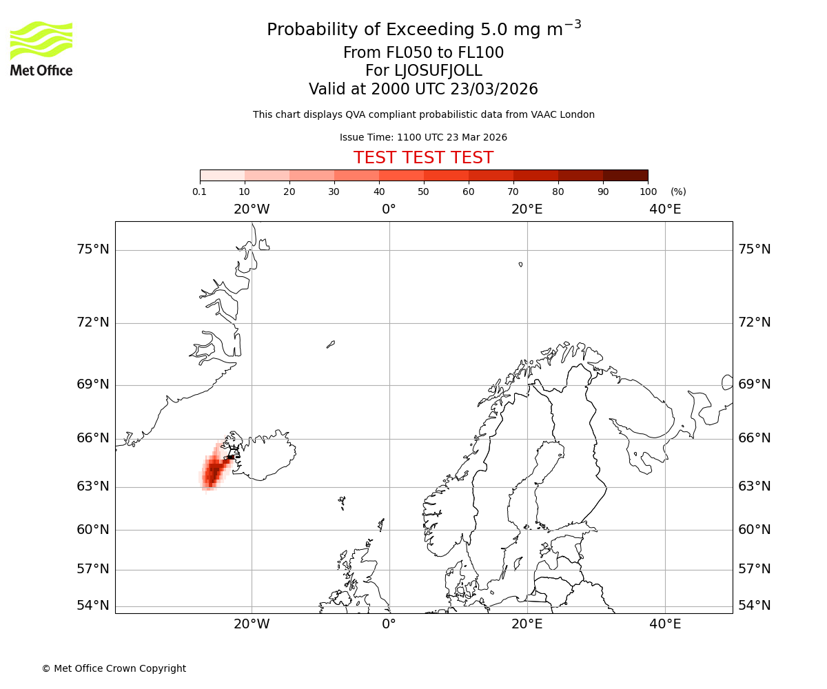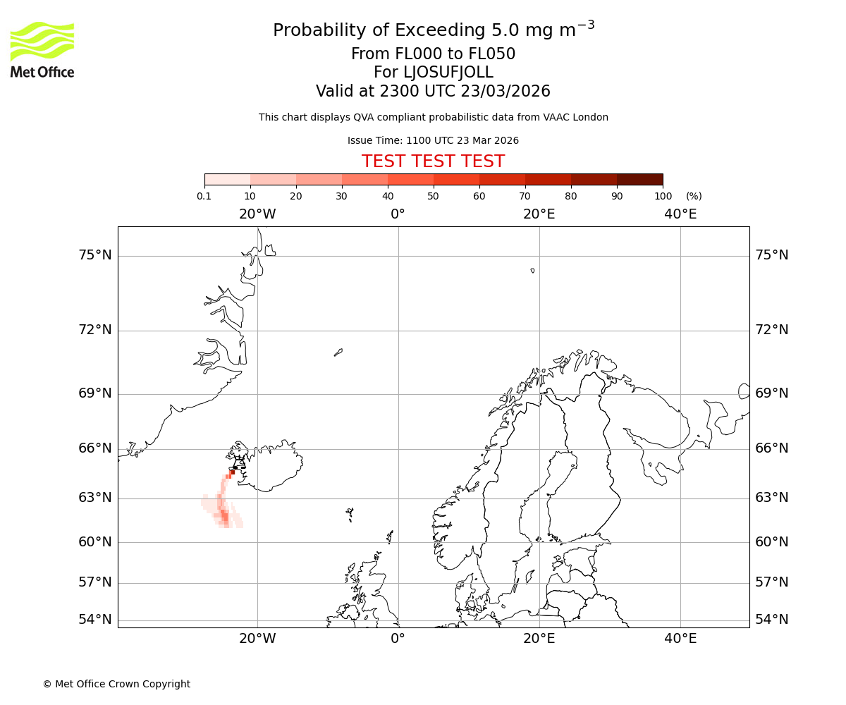 Modelled ash concentration from 000 to 050 for LJOSUFJOLL. Valid at 1100 UTC 23/03/2026