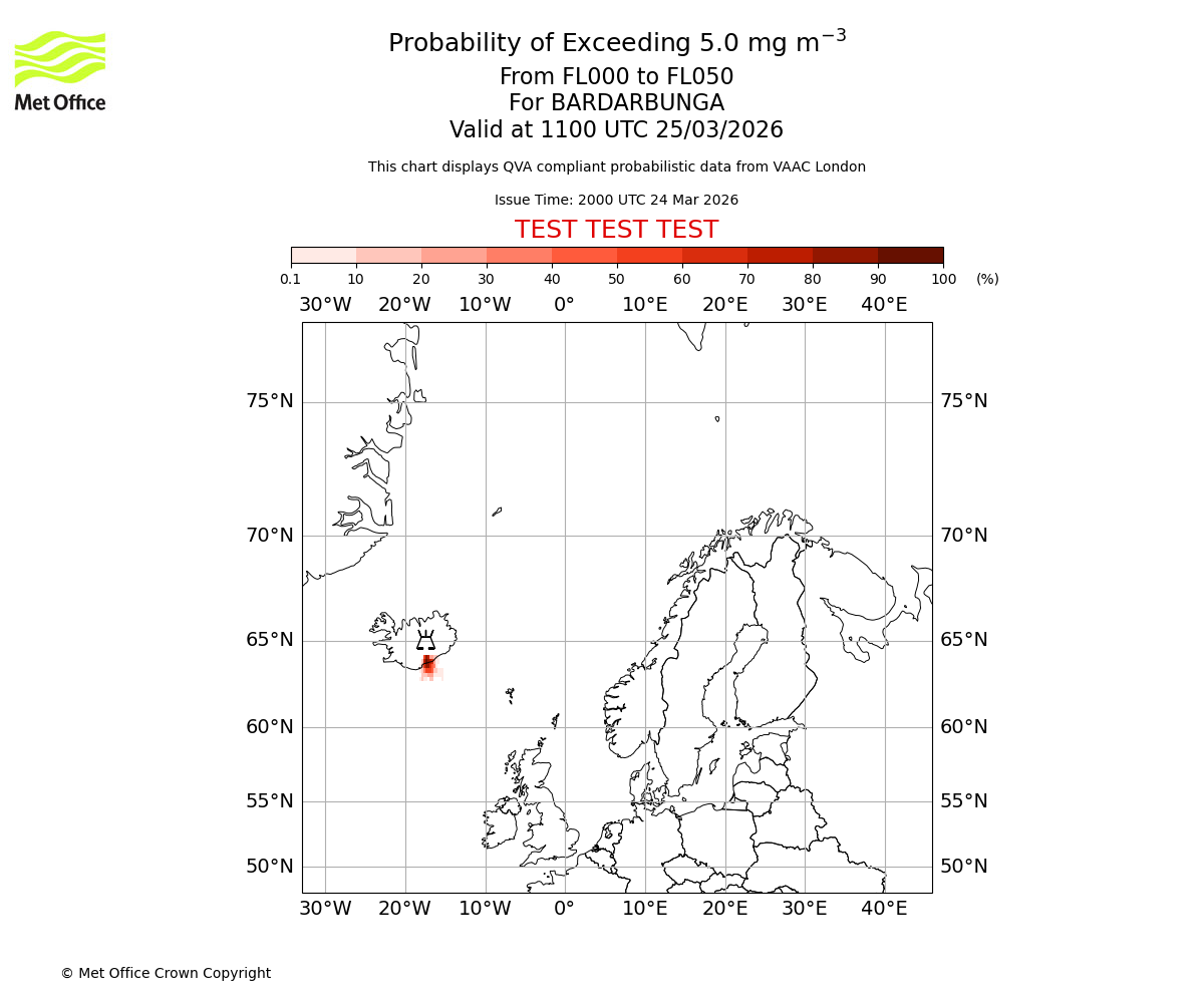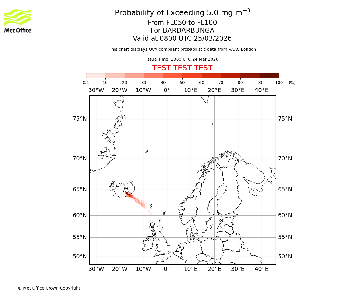 Probability of exceeding 5.0 milligrams per metre cubed. From 000 to 050 for BARDARBUNGA. Valid at 0800 UTC 25/03/2026