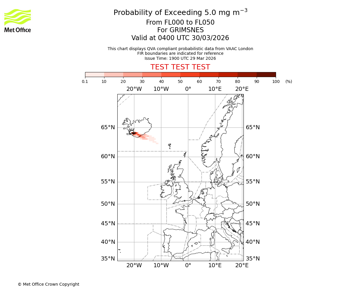 Probability of exceeding 5.0 milligrams per metre cubed. From 000 to 050 for GRIMSNES. Valid at 0100 UTC 30/03/2026