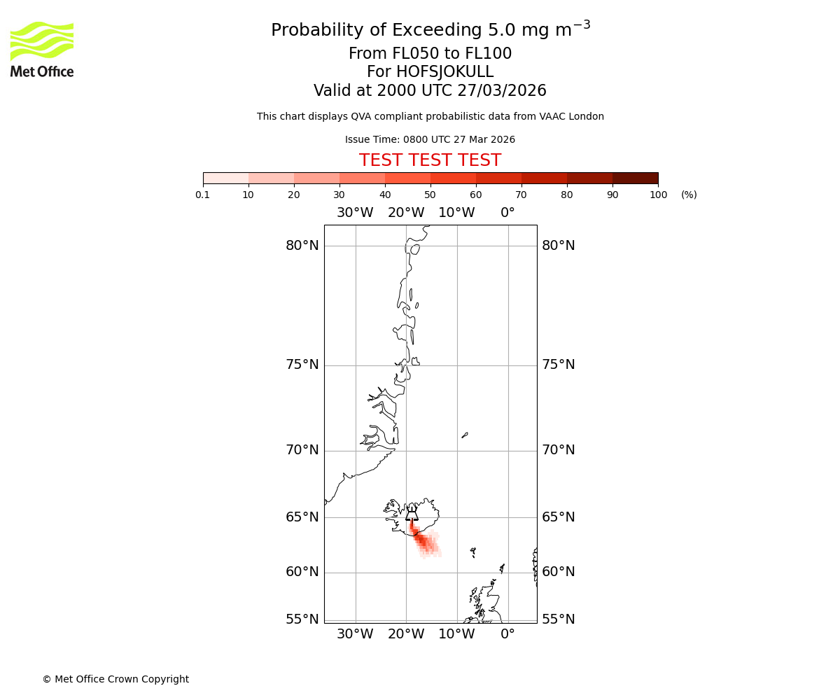 Probability of exceeding 5.0 milligrams per metre cubed. From 000 to 050 for HOFSJOKULL. Valid at 2000 UTC 27/03/2026
