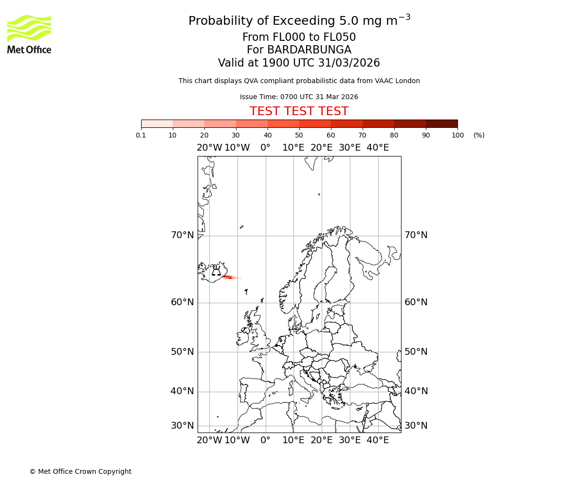Modelled ash concentration from 000 to 050 for BARDARBUNGA. Valid at 0700 UTC 31/03/2026