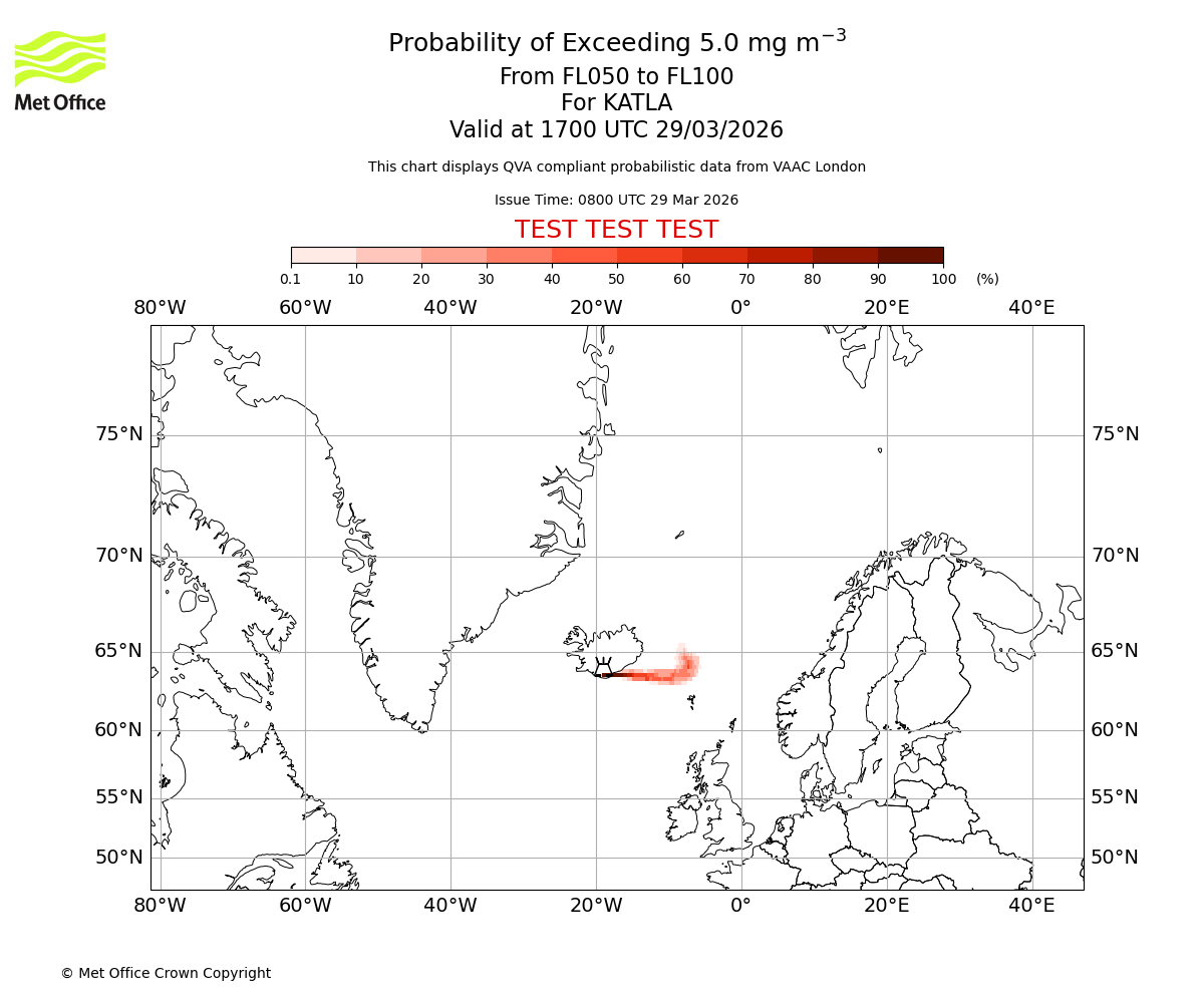 Probability of exceeding 5.0 milligrams per metre cubed. From 000 to 050 for KATLA. Valid at 1700 UTC 29/03/2026