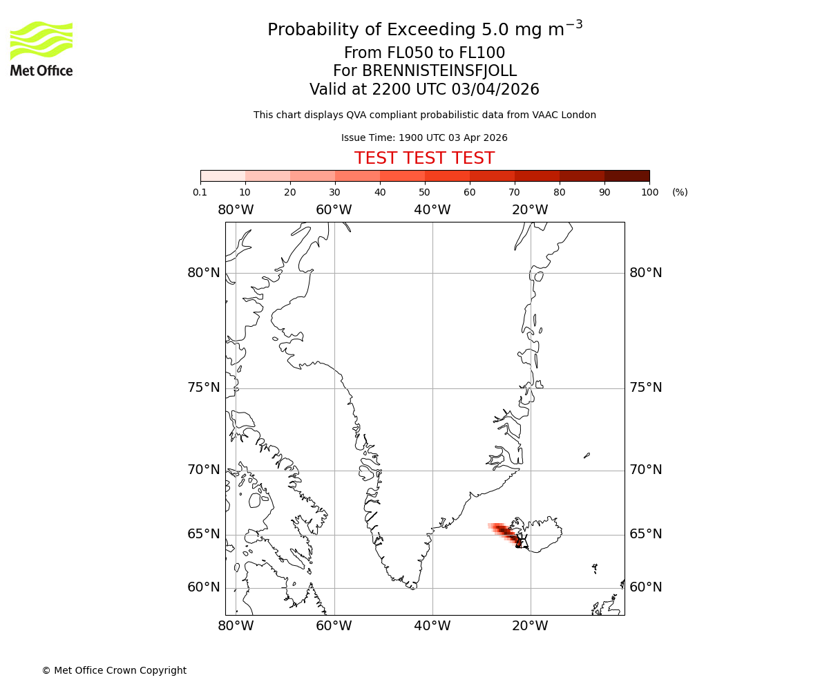 Quantitative Volcanic Ash charts (QVA) are produced in accordance with International Civil Aviation Organization (ICAO) Annex 3 requirements and are provided as well as the London Volcanic Ash Advisory Graphics (VAG) and Advisories (VAA). The lowest QVA threshold (0.2 mg/m³) matches to the areas depicted in the VAA and VAG. Both expected ash concentration and probabilistic forecast information is provided in the chart viewer below for eruptions occurring in the London Volcanic Ash Advisory Centre (VAAC) area of responsibility.