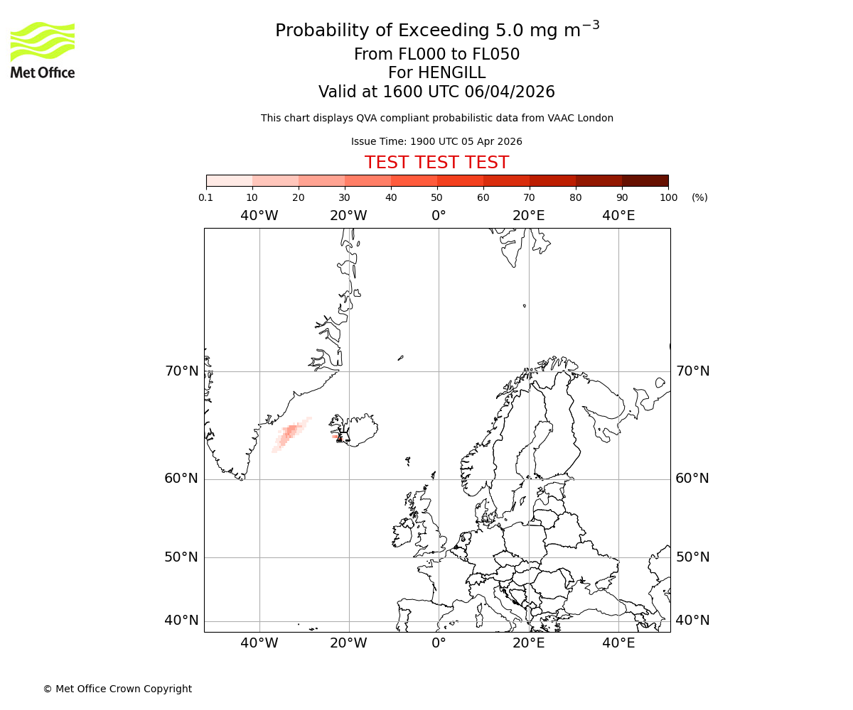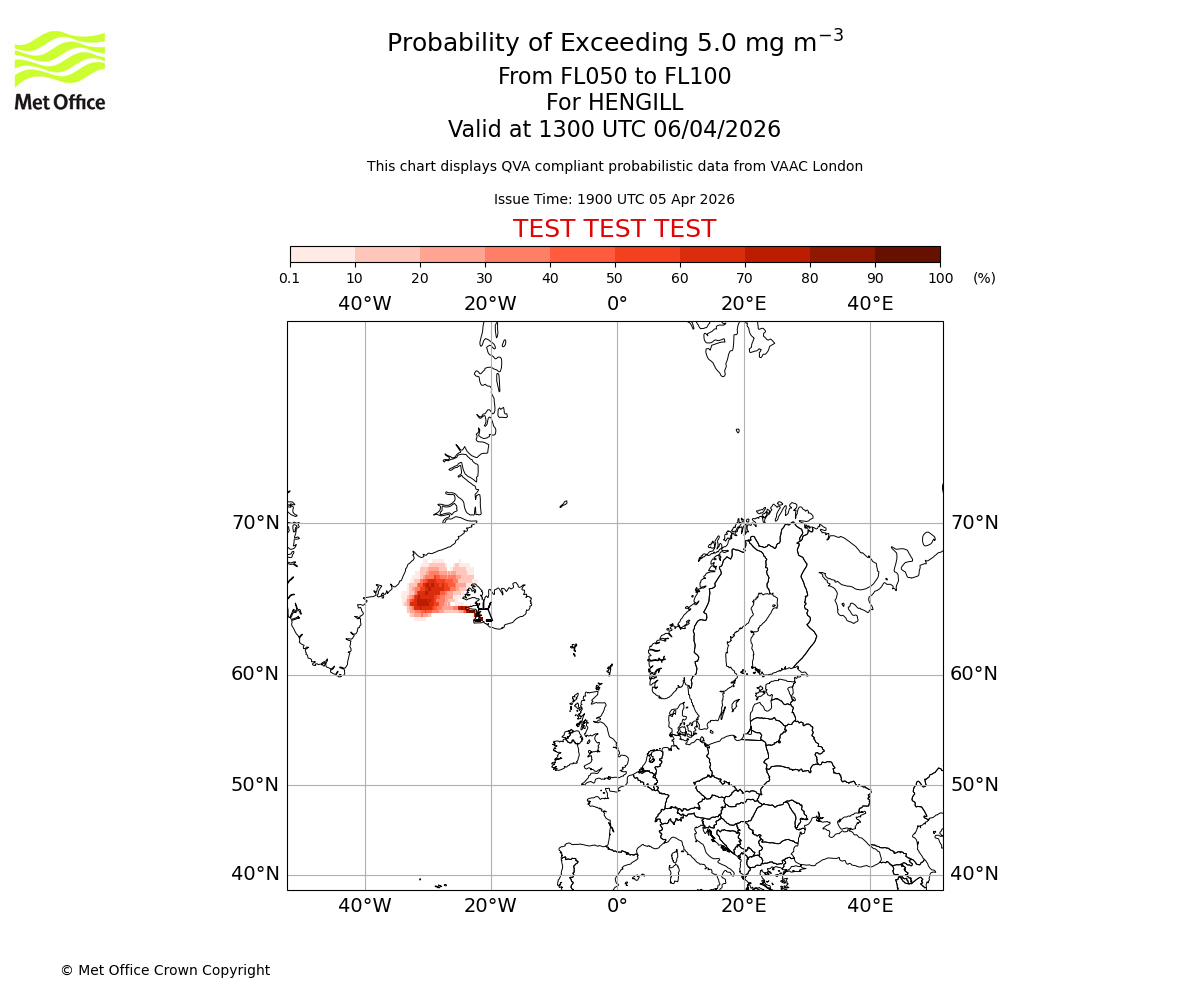 Probability of exceeding 5.0 milligrams per metre cubed. From 000 to 050 for HENGILL. Valid at 1300 UTC 06/04/2026