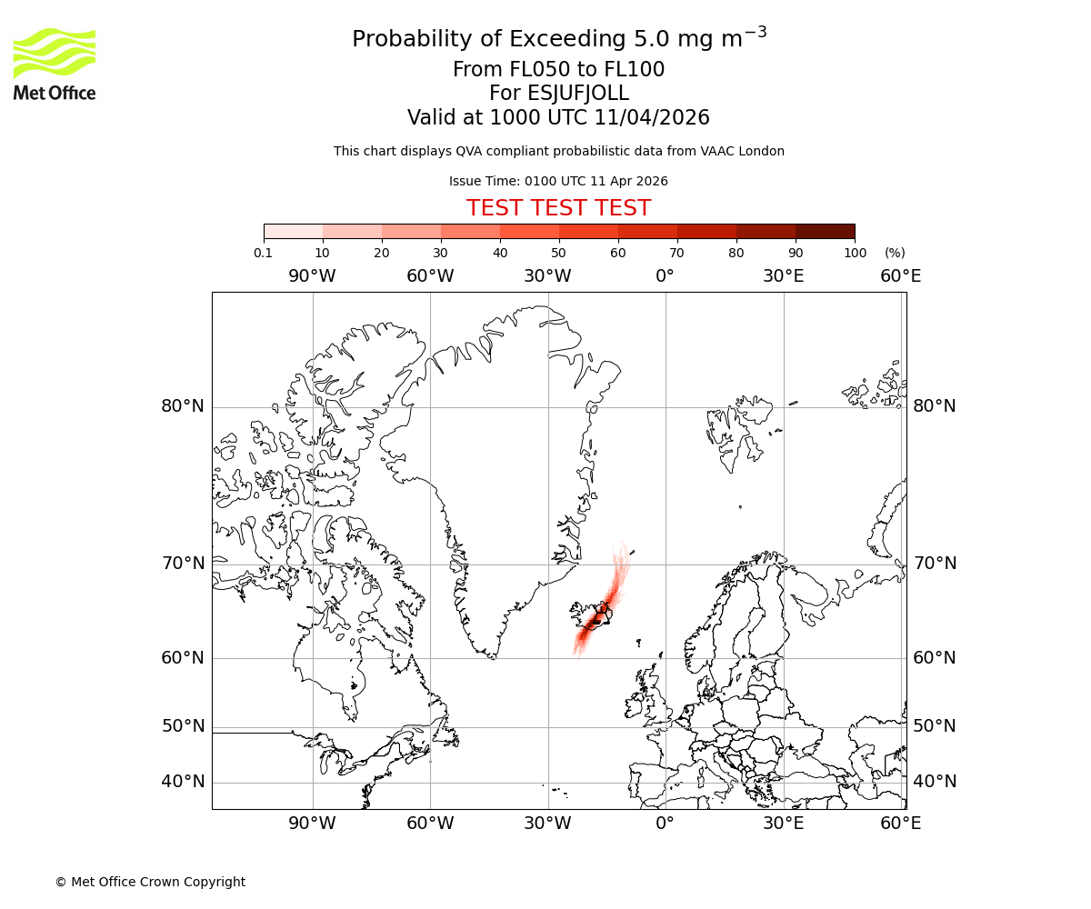 Modelled ash concentration from 000 to 050 for ESJUFJOLL. Valid at 0100 UTC 11/04/2026