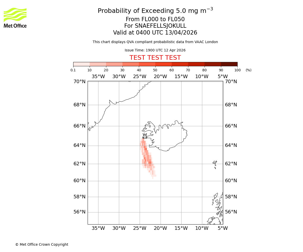 Modelled ash concentration from 000 to 050 for SNAEFELLSJOKULL. Valid at 1900 UTC 12/04/2026