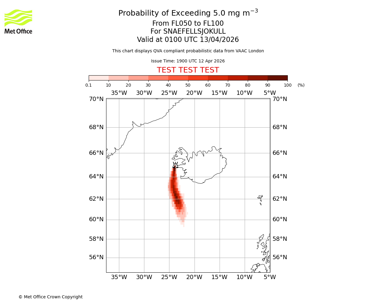 Probability of exceeding 5.0 milligrams per metre cubed. From 000 to 050 for SNAEFELLSJOKULL. Valid at 0100 UTC 13/04/2026