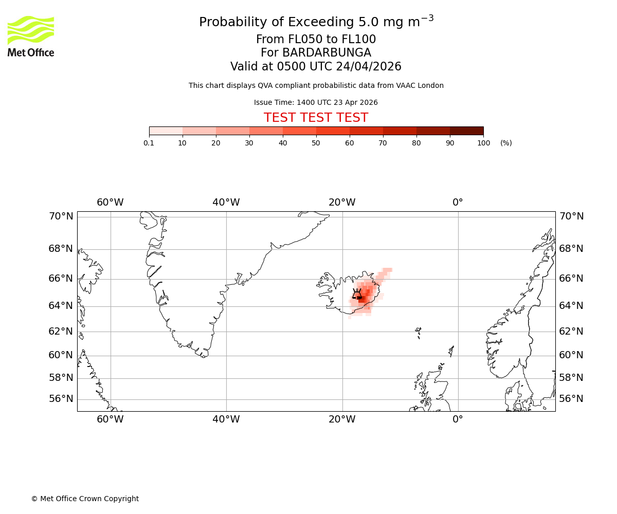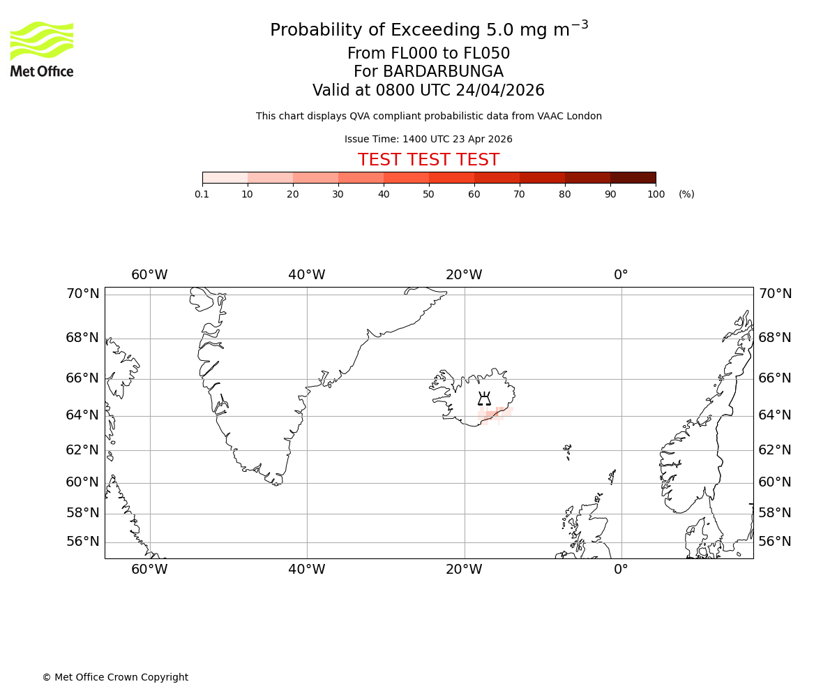 Probability of exceeding 5.0 milligrams per metre cubed. From 000 to 050 for BARDARBUNGA. Valid at 0500 UTC 24/04/2026