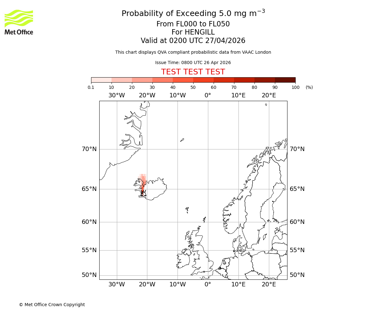 Probability of exceeding 5.0 milligrams per metre cubed. From 000 to 050 for HENGILL. Valid at 2300 UTC 26/04/2026