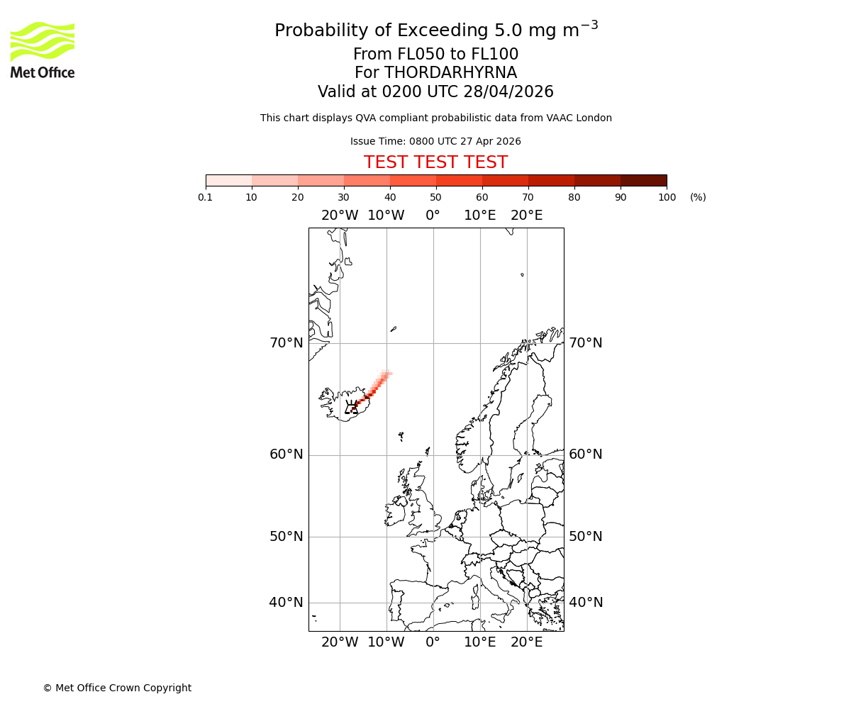 Probability of exceeding 5.0 milligrams per metre cubed. From 000 to 050 for THORDARHYRNA. Valid at 0200 UTC 28/04/2026