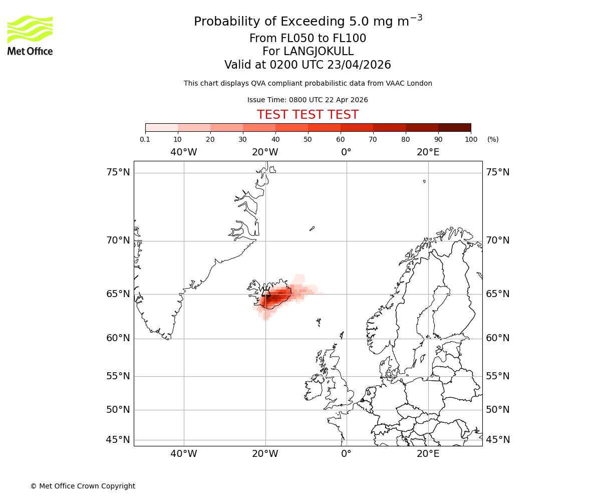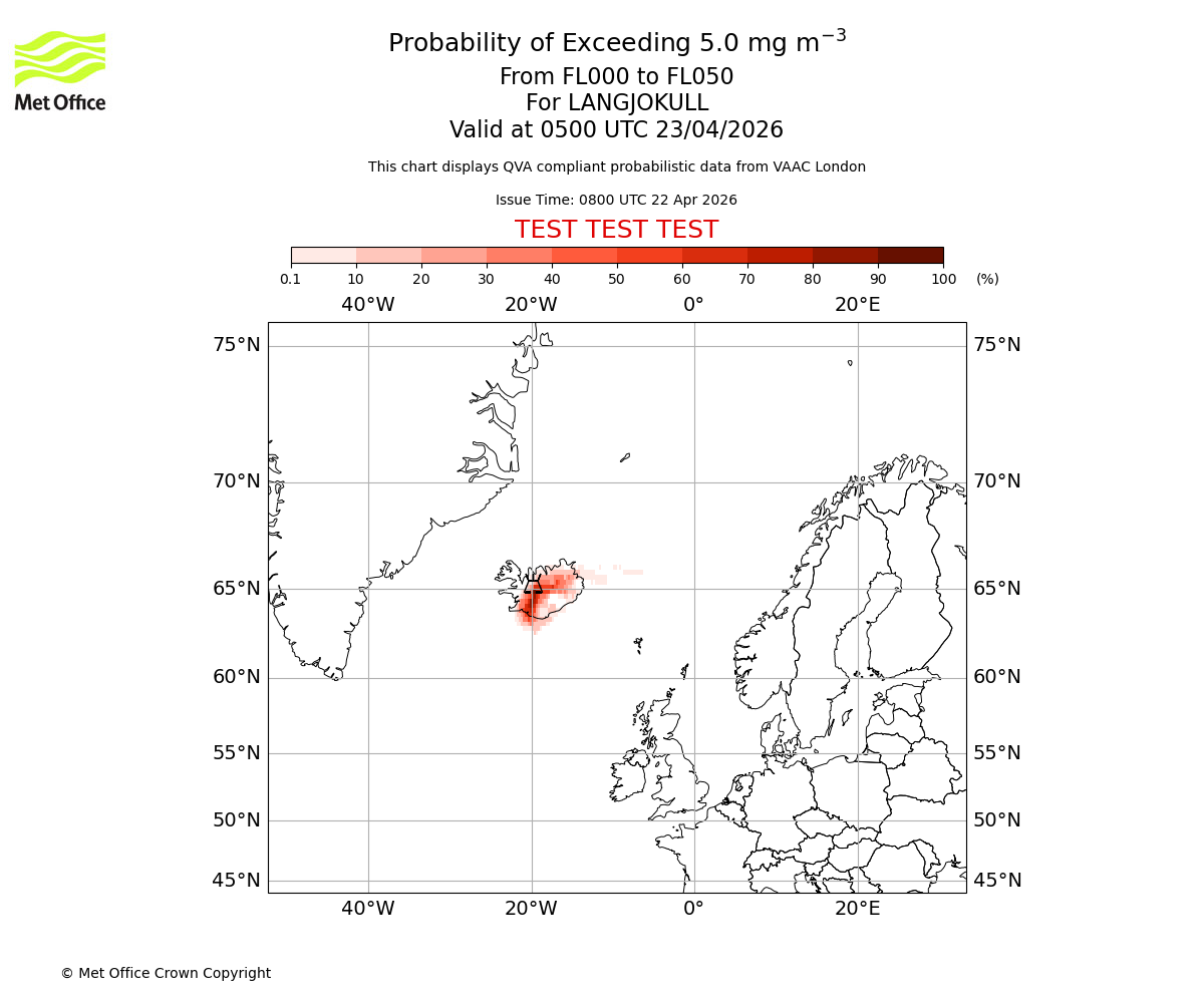 Probability of exceeding 5.0 milligrams per metre cubed. From 000 to 050 for LANGJOKULL. Valid at 0200 UTC 23/04/2026