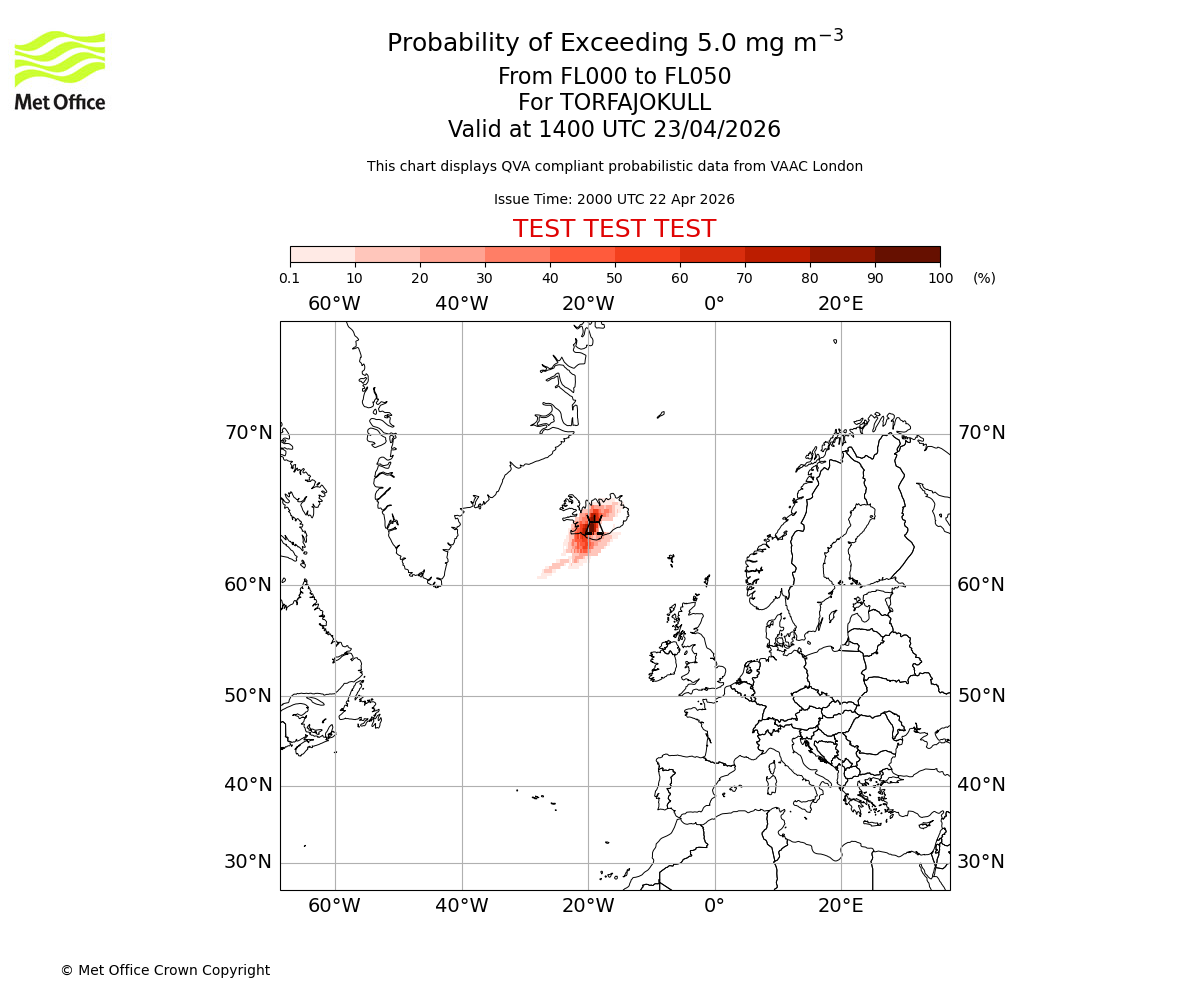 Modelled ash concentration from 000 to 050 for TORFAJOKULL. Valid at 2000 UTC 22/04/2026