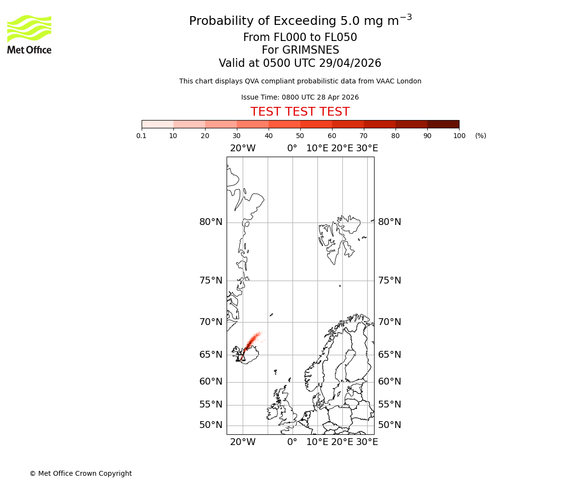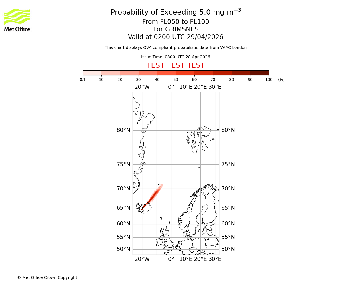 Probability of exceeding 5.0 milligrams per metre cubed. From 000 to 050 for GRIMSNES. Valid at 0200 UTC 29/04/2026