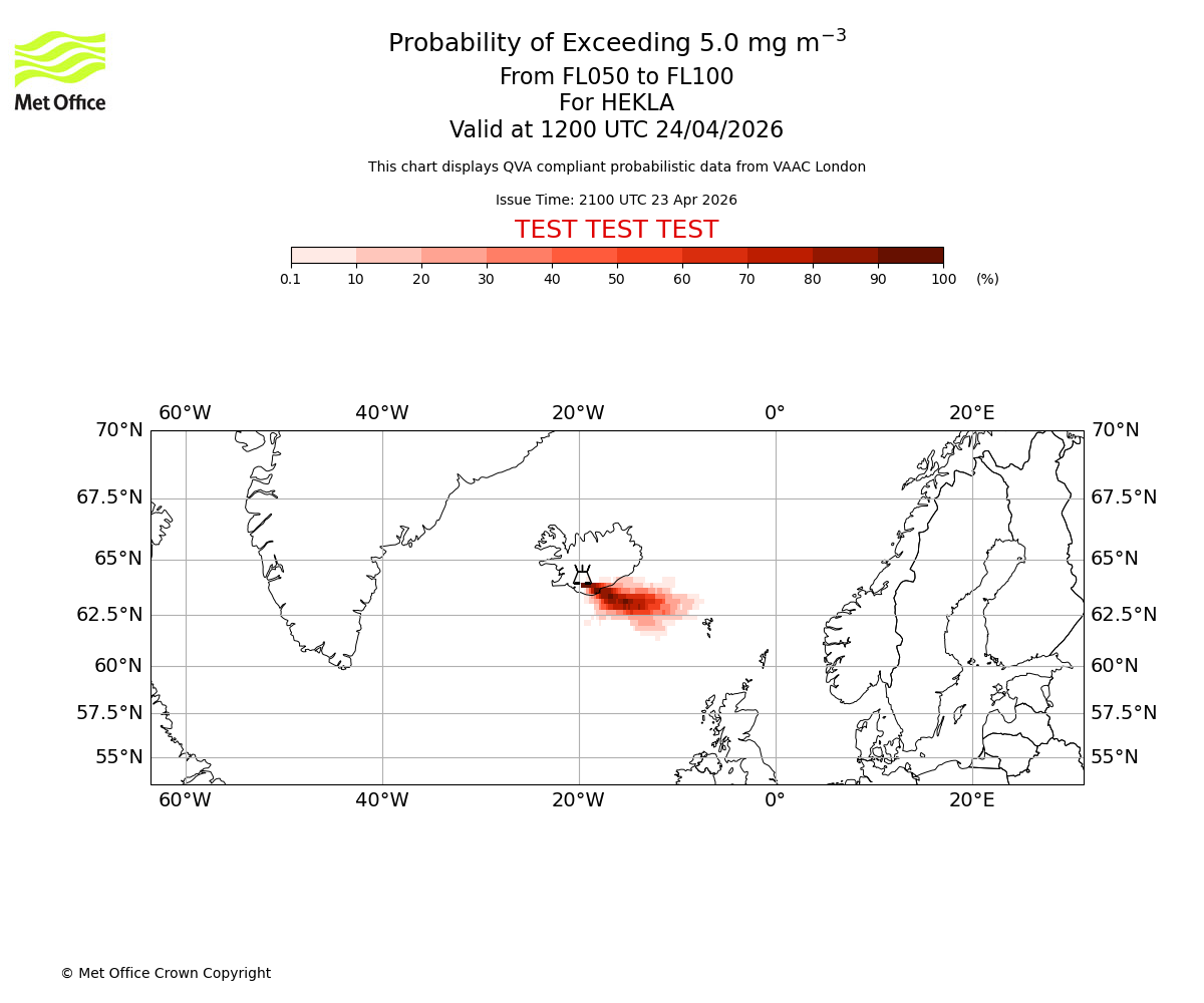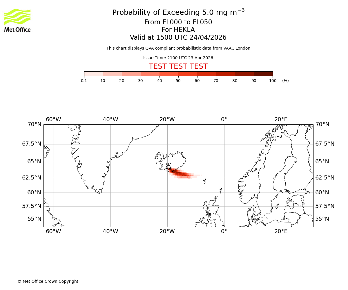 Probability of exceeding 5.0 milligrams per metre cubed. From 000 to 050 for HEKLA. Valid at 1200 UTC 24/04/2026