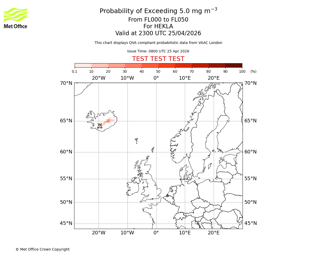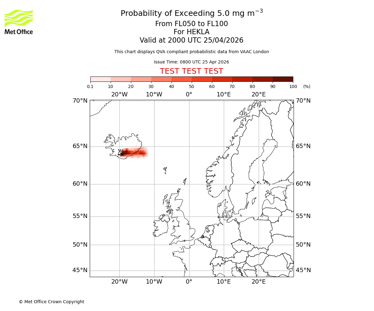 Probability of exceeding 5.0 milligrams per metre cubed. From 000 to 050 for HEKLA. Valid at 2000 UTC 25/04/2026