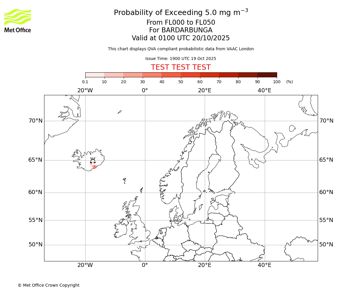 Modelled ash concentration from 000 to 050 for BARDARBUNGA. Valid at 1900 UTC 19/10/2025