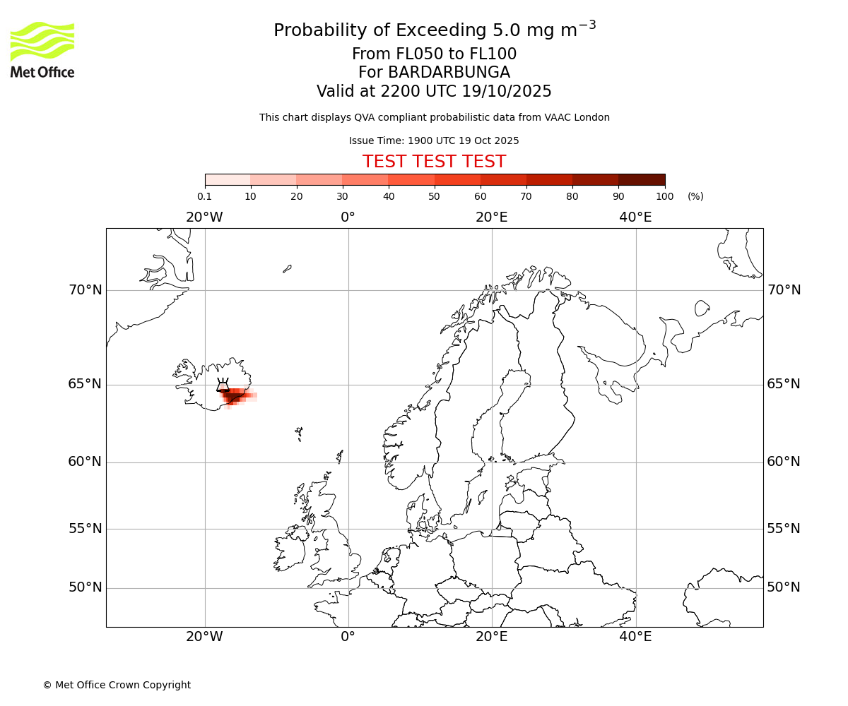 Probability of exceeding 5.0 milligrams per metre cubed. From 000 to 050 for BARDARBUNGA. Valid at 2200 UTC 19/10/2025