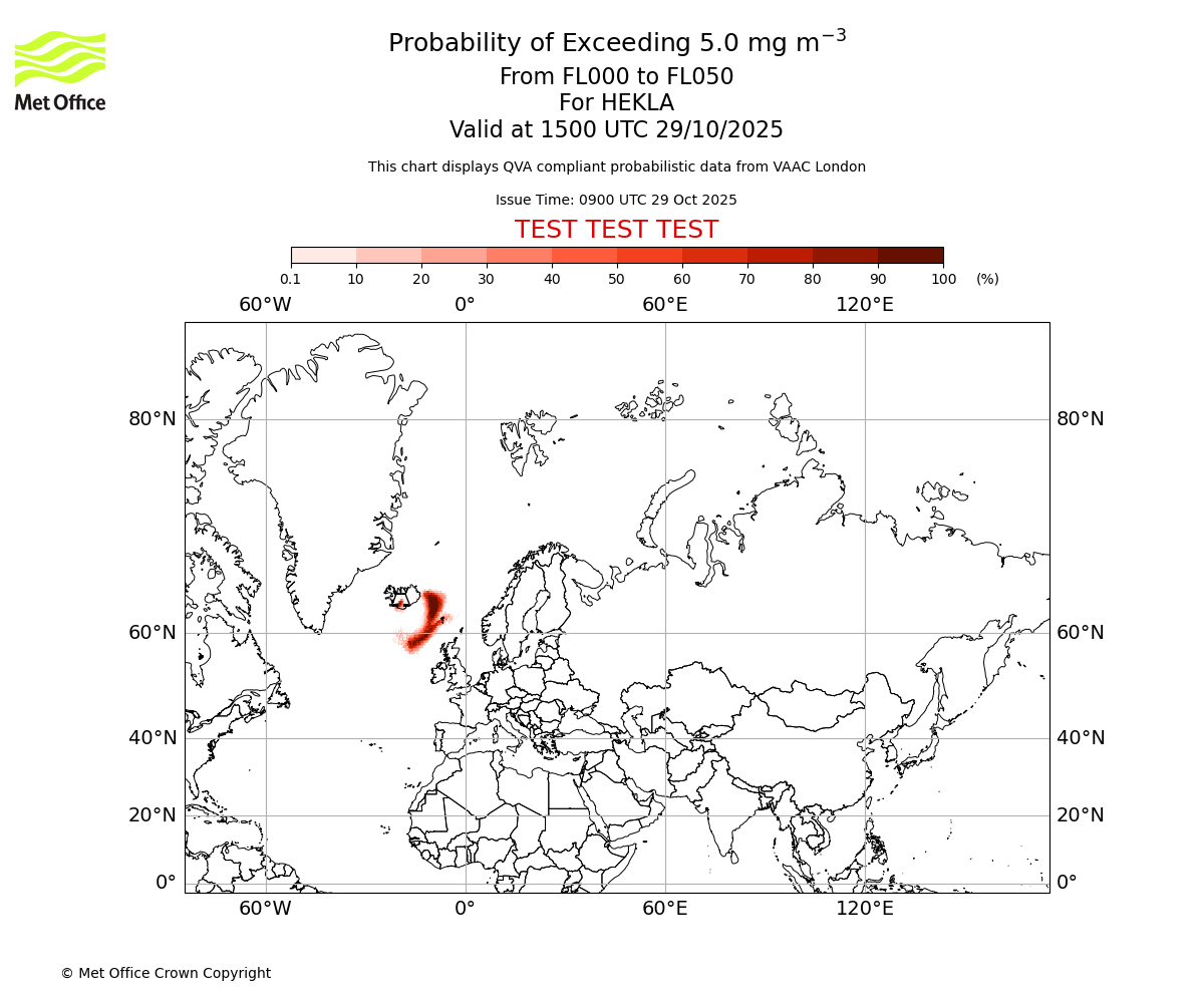 Probability of exceeding 5.0 milligrams per metre cubed. From 000 to 050 for HEKLA. Valid at 1200 UTC 29/10/2025