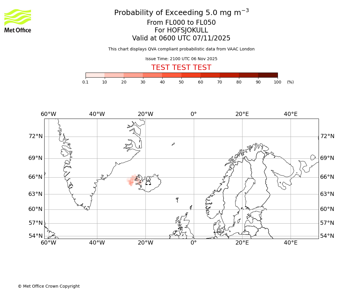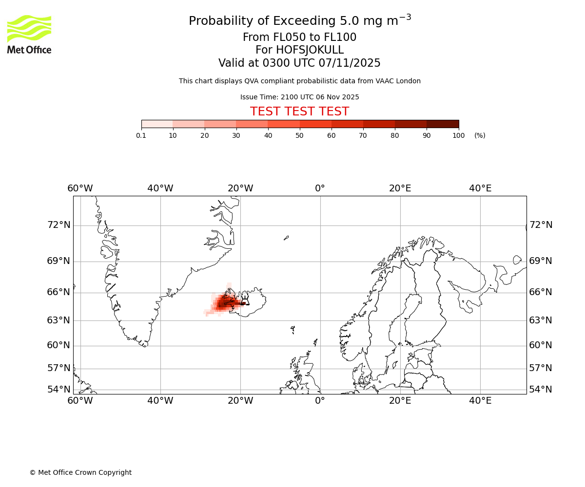 Probability of exceeding 5.0 milligrams per metre cubed. From 000 to 050 for HOFSJOKULL. Valid at 0300 UTC 07/11/2025