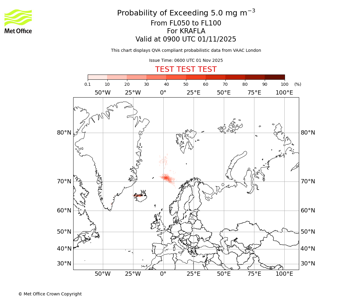 Probability of exceeding 5.0 milligrams per metre cubed. From 000 to 050 for KRAFLA. Valid at 0900 UTC 01/11/2025