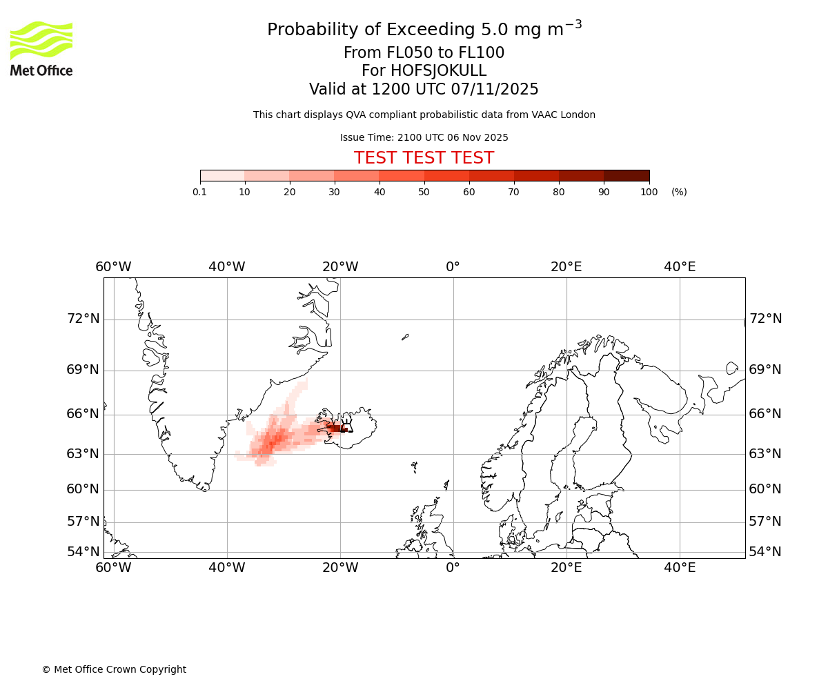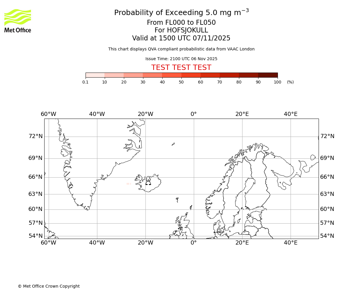 Probability of exceeding 5.0 milligrams per metre cubed. From 000 to 050 for HOFSJOKULL. Valid at 1200 UTC 07/11/2025