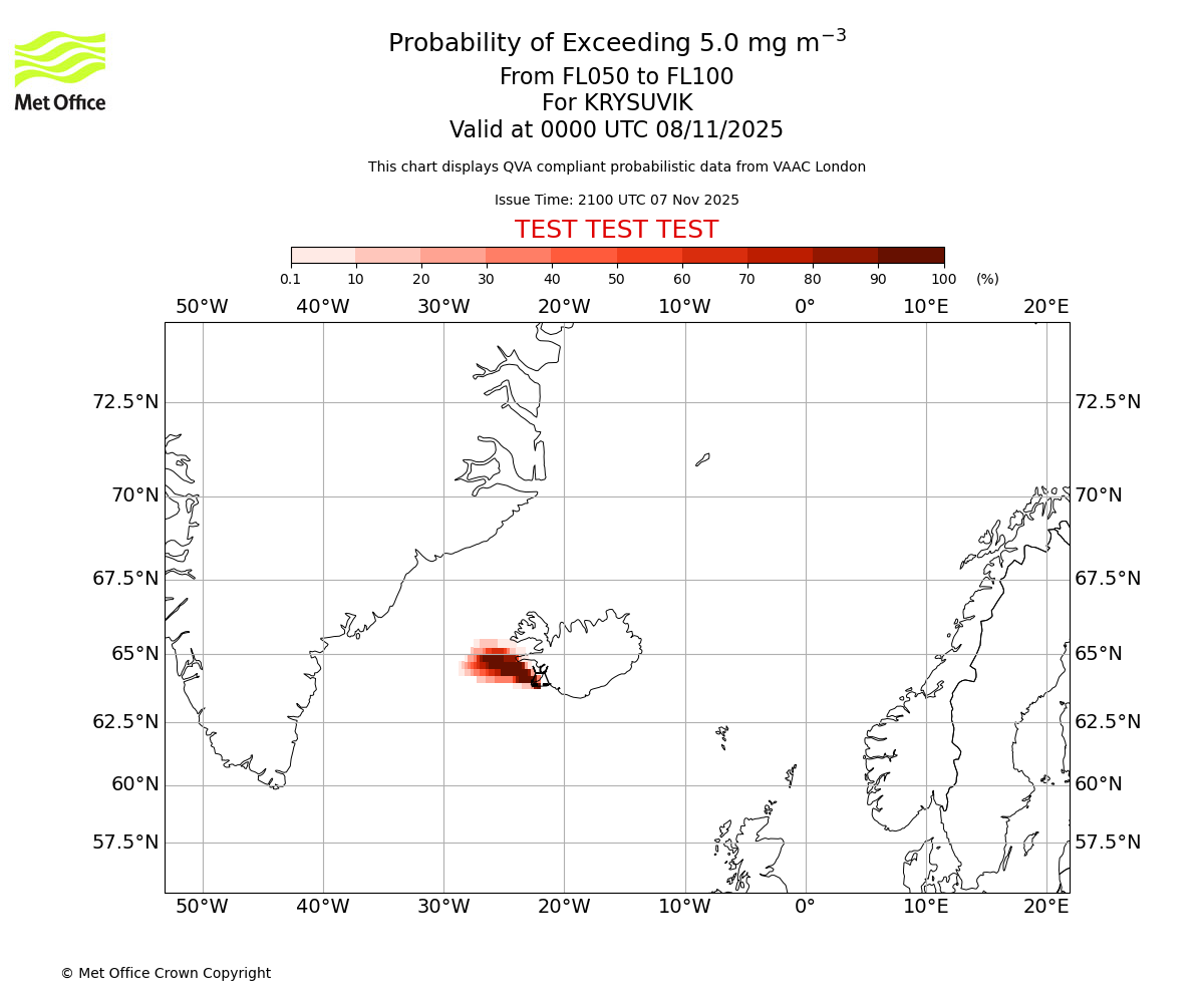 Probability of exceeding 5.0 milligrams per metre cubed. From 000 to 050 for KRYSUVIK. Valid at 0000 UTC 08/11/2025