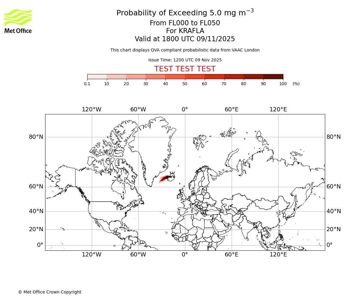 Modelled ash concentration from 000 to 050 for KRAFLA. Valid at 1200 UTC 09/11/2025