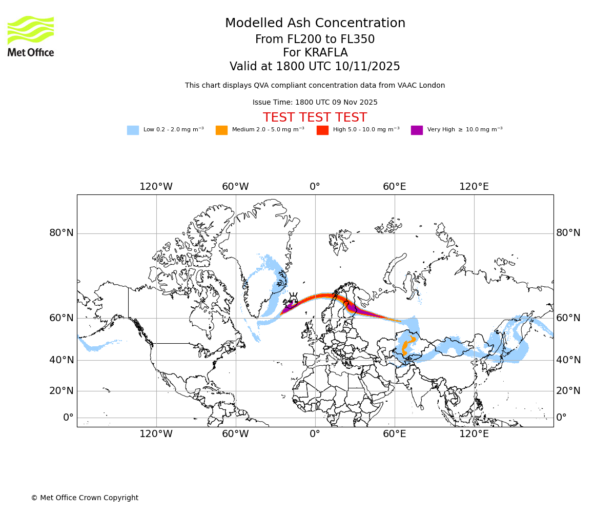 In accordance with ICAO Annex 3, Amendment 82 VAAC London will provide operational QVA forecasts from 27 November 2025 and these will be made available via a VAAC London QVA API information service. These charts are currently provided for test and evaluation purposes (not for operational use) until the introduction of the operational service.