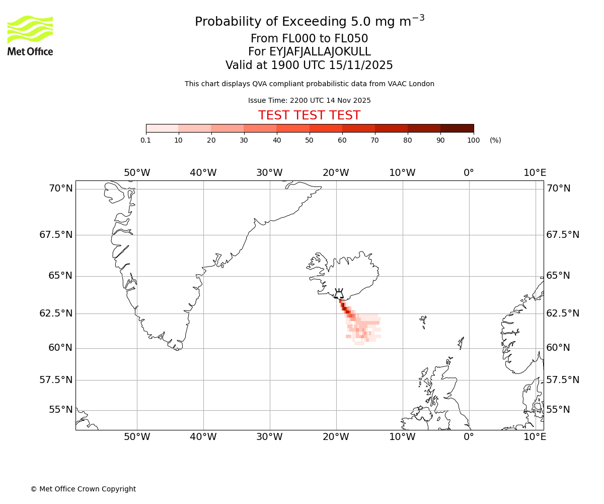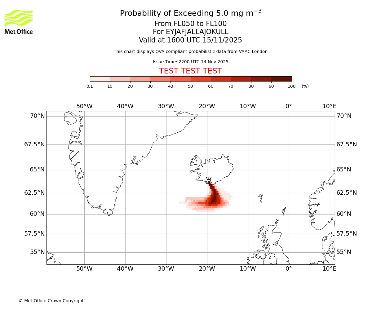 Probability of exceeding 5.0 milligrams per metre cubed. From 000 to 050 for EYJAFJALLAJOKULL. Valid at 1600 UTC 15/11/2025
