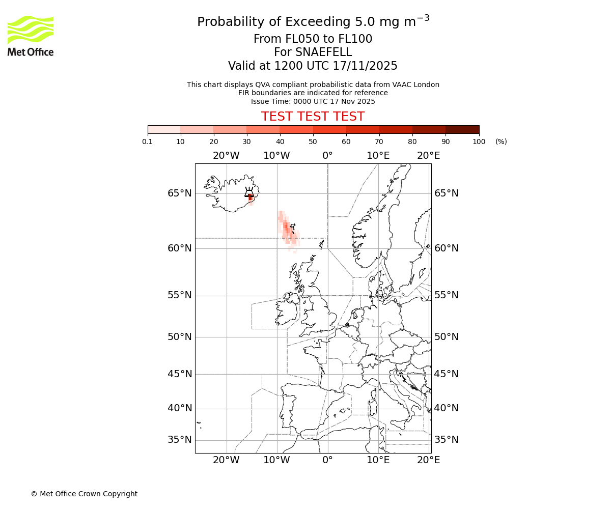 Probability of exceeding 5.0 milligrams per metre cubed. From 000 to 050 for SNAEFELL. Valid at 1200 UTC 17/11/2025