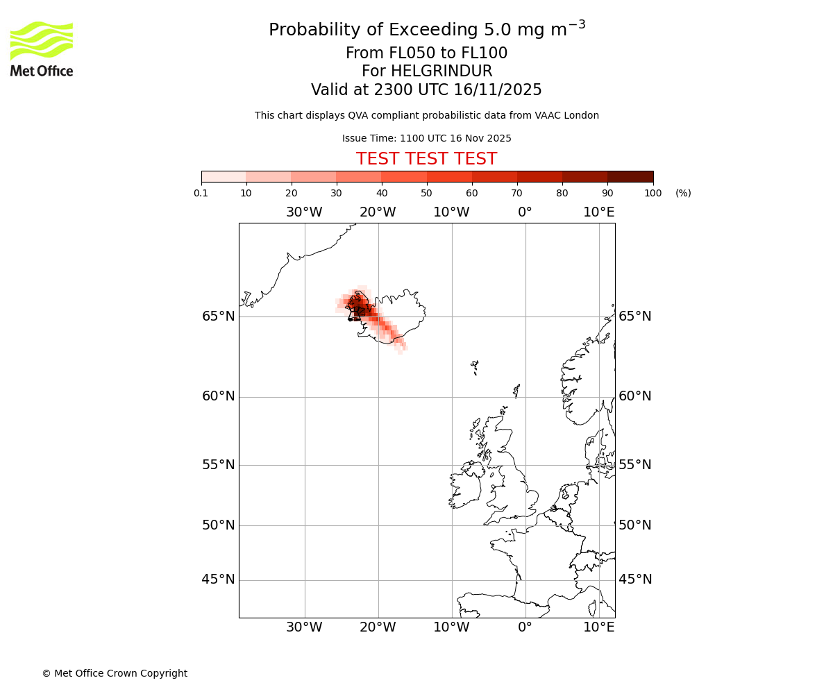 Probability of exceeding 5.0 milligrams per metre cubed. From 000 to 050 for HELGRINDUR. Valid at 2300 UTC 16/11/2025