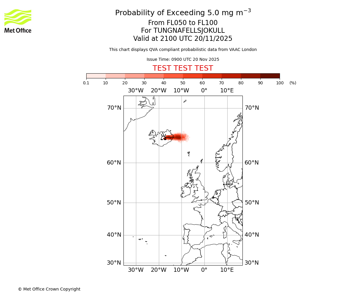 Probability of exceeding 5.0 milligrams per metre cubed. From 000 to 050 for TUNGNAFELLSJOKULL. Valid at 2100 UTC 20/11/2025