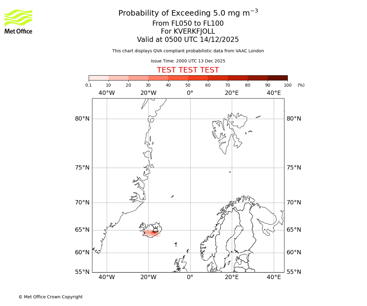 Modelled ash concentration from 000 to 050 for KVERKFJOLL. Valid at 2000 UTC 13/12/2025