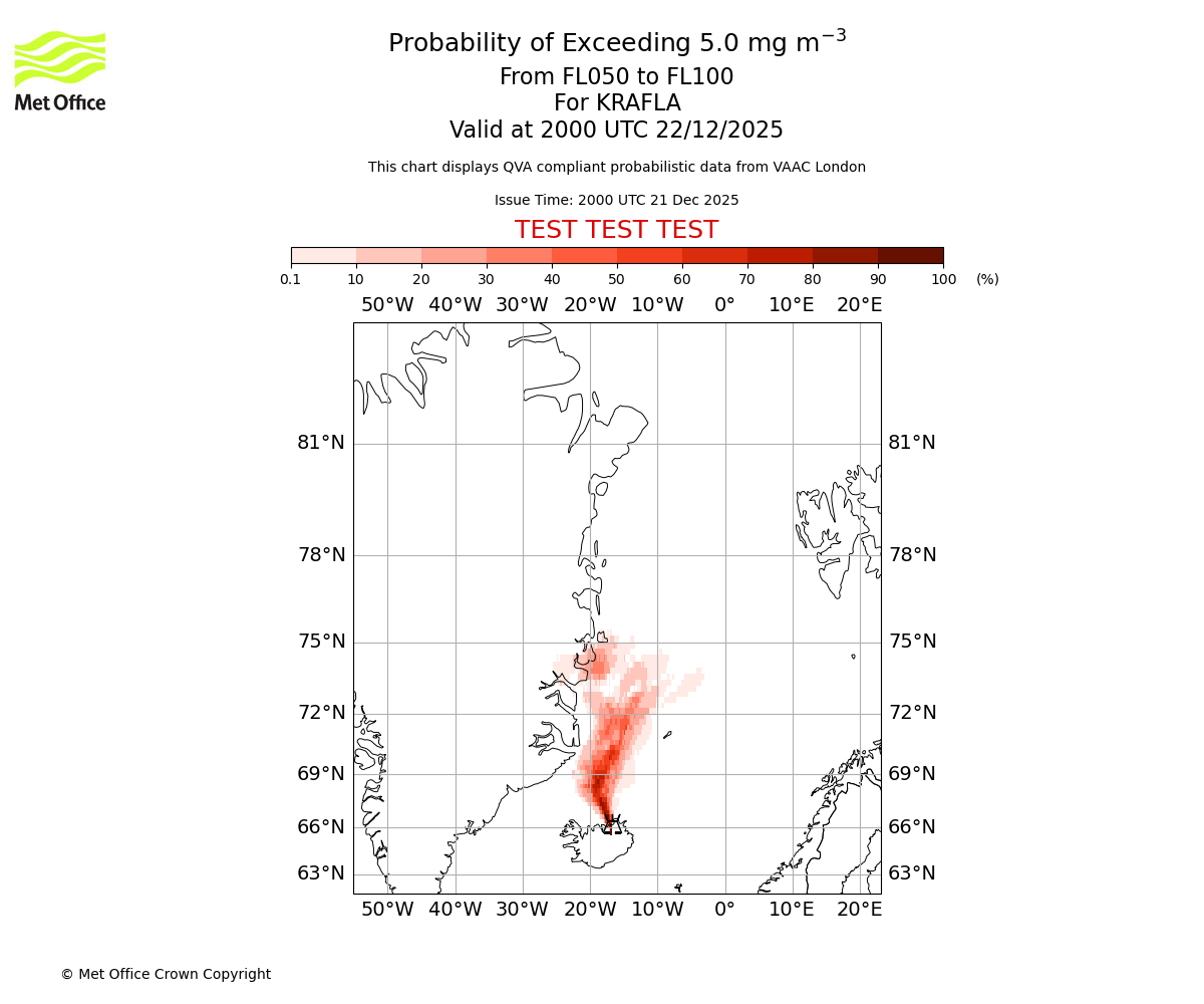 Probability of exceeding 5.0 milligrams per metre cubed. From 000 to 050 for KRAFLA. Valid at 2000 UTC 22/12/2025