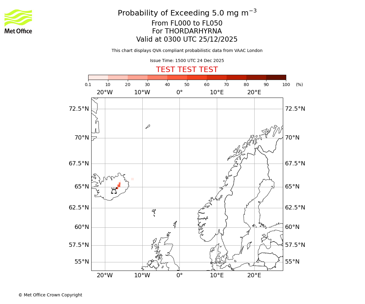 Probability of exceeding 5.0 milligrams per metre cubed. From 000 to 050 for THORDARHYRNA. Valid at 0000 UTC 25/12/2025