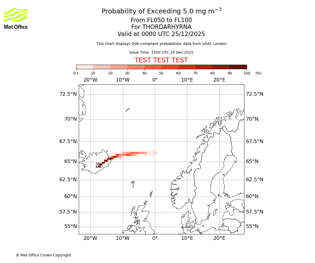 Modelled ash concentration from 000 to 050 for THORDARHYRNA. Valid at 1500 UTC 24/12/2025