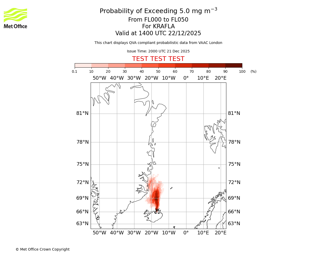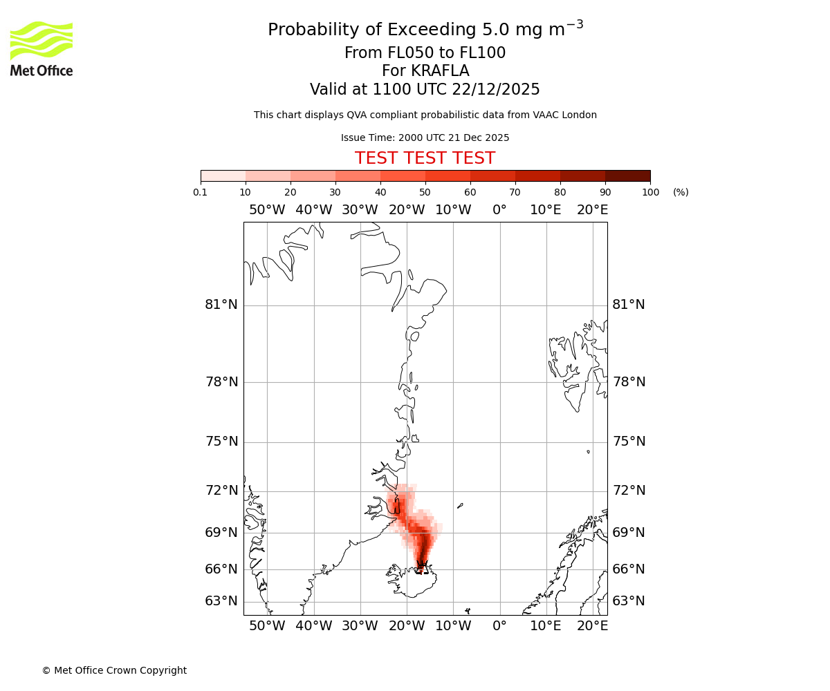 Probability of exceeding 5.0 milligrams per metre cubed. From 000 to 050 for KRAFLA. Valid at 1100 UTC 22/12/2025