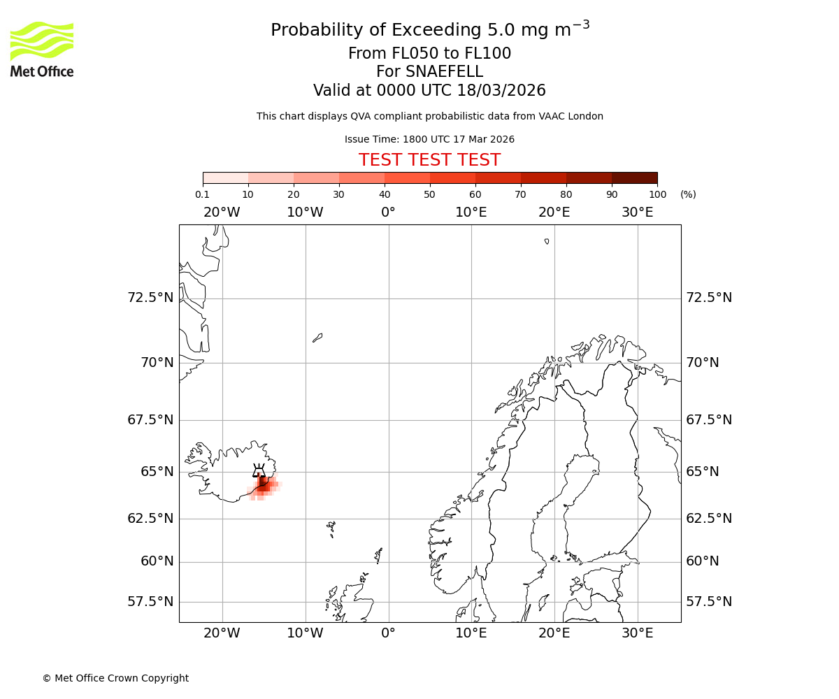 Probability of exceeding 5.0 milligrams per metre cubed. From 000 to 050 for SNAEFELL. Valid at 0000 UTC 18/03/2026
