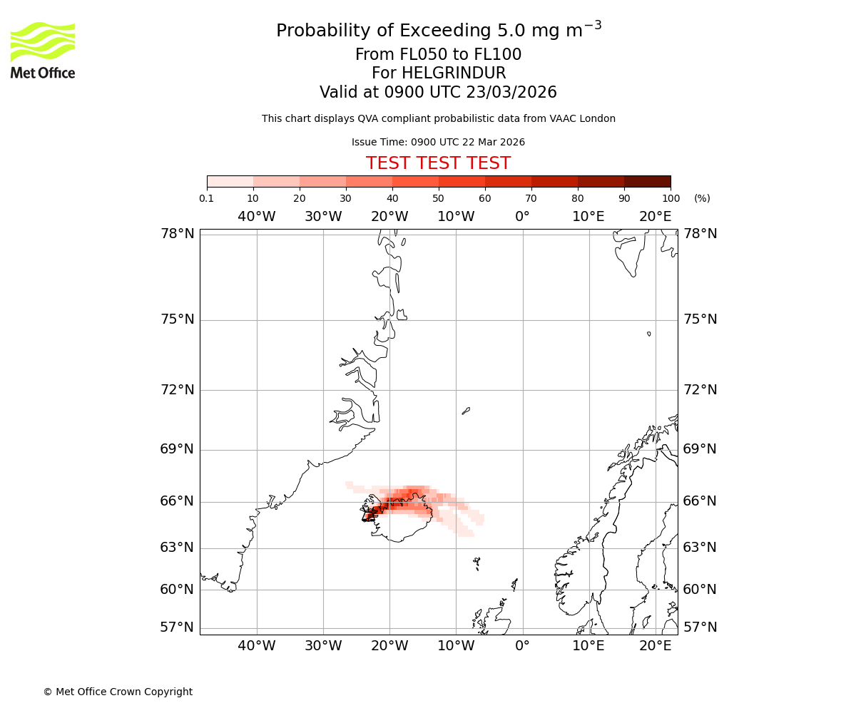 Probability of exceeding 5.0 milligrams per metre cubed. From 000 to 050 for HELGRINDUR. Valid at 0900 UTC 23/03/2026